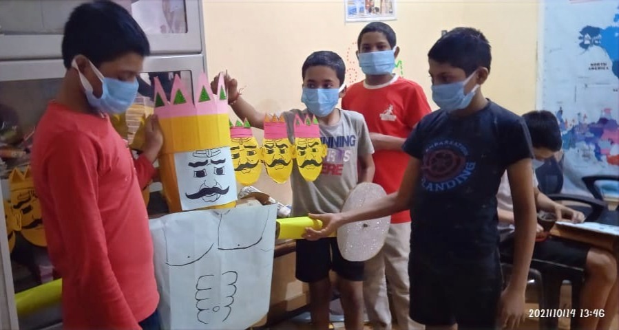 Boys at an SBT shelter home preparing craft ravans for the Dussehra celebrations, the fight of good over evil. October 2021